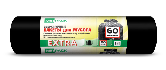 Мешки для мусора 60 литров, 12 мкм, ПНД, черные, в рулоне 20 шт, 60х70 см, особопрочные, MIRPACK